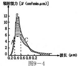 5、单选题 图9-4是近地面(虚线)和大气上界(实线)太阳辐射波长分布示意图,读图回答下列问题