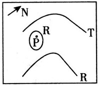 1、单选题 下图为等高线图,T,R代表海拔高度,读图回答1—2题。