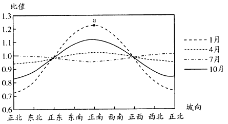 1、单选题 下图表示27。N某地坡向(坡度为10。)对地表获得太阳辐射的影响,纵坐标表示该地坡面与地平面获得太阳辐射量的比值(仅考虑地球运动和地形因素)。读图完成1~2题。