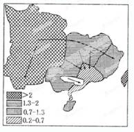 1.广东人口稠密,但实际人口密度与理论人口承载密度之比在图示区域中最小,所以广东的环境人口容量最大。