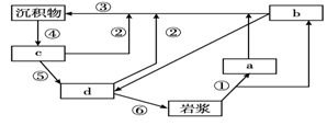 本题解析:1.地球内部的岩浆,经过冷却凝固形成岩浆岩,岩浆岩受流水、风、冰川、海浪等的侵蚀、搬运、堆积作用,形成沉积岩。同时,这些已生成的岩石,在一定温度和压力等作用下发生变质,形成变质岩。各类岩石在地壳深处或地壳以下发生重熔再生作用,又成为新的岩浆。所以a为侵入型岩浆岩,b为喷出型岩浆岩,c为沉积岩,d为变质岩。所以本题选择A选项。