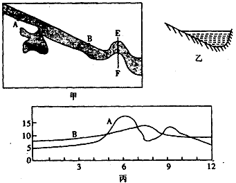 4、单选题 ? 下图中甲是我国东部河流某河段示意图,乙是EF河段河床示意图,丙是河流A,B两水文站测得的水位变化图。据此完成1—3题。