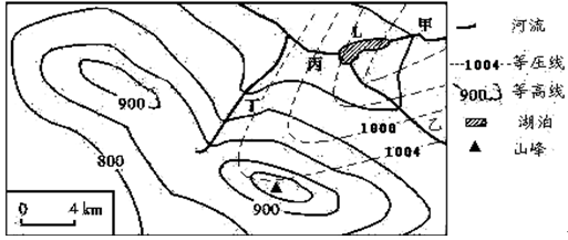 2、单选题 图为我国某地等高线图(单位:米)及某日某时海平面等压线分布图(单位:百帕)。