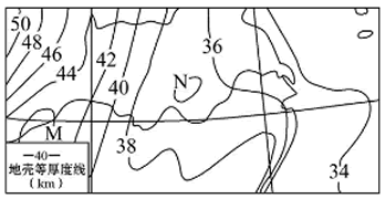 小题1:依据图示地区的地壳厚度分布规律分析,N处地势特点是