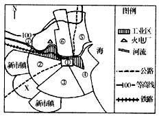 4、综合题 下图是“我国某海滨小城的城区规划布局图”,读图回答下列问题。