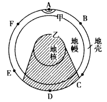 (2)本题考查地震波,地震波分为纵波(P)和横波(S)。纵波可以通过固、液、气体。横波只能通过固体。纵波波速比横波快。所以E是横波,F为纵波。