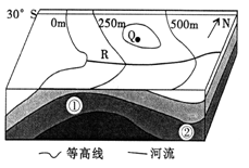 4、单选题 图为30°S附近沿海某地等高线地形图和地层示意图,R河流正值汛期。读图回答下列各题。