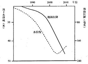 小题1:当地面沉降超过80毫米时,这时的地下水位称为警戒水位。该警戒水位和出现的时间大概是