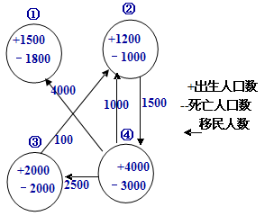 2、单选题 读四城市某年人口变动资料图(变动前,四城市人口相等)。回答问题。