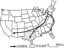 1、综合题 读“美国本土老年人口向南方阳光地带的迁移示意图(1955—1960年)”,按要求回答: