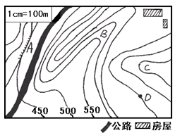 (1)B处等高线向高处弯曲,判断为山谷。图中等高线的间距为50米,D处海拔700米。