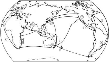 5、综合题 读“世界主要航线与海港图”,完成下列问题。