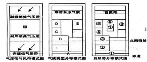 (5)D是____________气候,E是____________气候,这两种气候类型对应同一种自然带是“自然带分布模式图”中的 (数字代号)和________(数字代号)带。(4分)