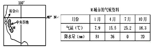 1、单选题 中央谷地位于海岸山脉和内华达山之间,是美国重要的水果和蔬菜生产基地。M为中央谷地中某城市,该城市的平均海拔为52米。据此回答下列各题。