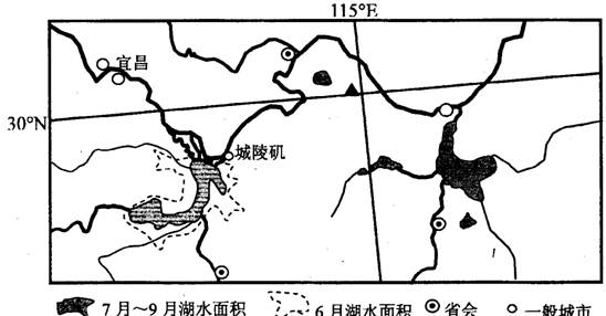 (2)洞庭湖7~9月与6月相比,湖水面积有何变化,并解释这种变化的自然原因。(4分)