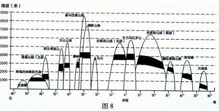 5、单选题 林线是指高海拔山地的森林分布上限,也就是高山林线。图8为全球部分山脉、山地高山林线海拔高度示意图。读图,完成以下各题。