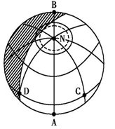 4、综合题 (14分) 如图示意某日昼夜分布状况,阴影部分表示黑夜,地球扁率忽略不计。图中虚线为北极圈,相邻经线的经度差相等,此时D点地方时为6时。读图回答下列问题。