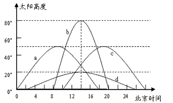 5、单选题 读a、b、c、d四地太阳高度变化图,完成(1)——(2)题。