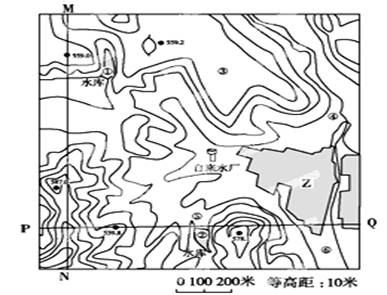 1、单选题  如图是某地地形图,MN、PQ是地形剖面线。①、②是水库,若从中选择一个作为自来水厂的水源地,其条件是自流引水且工程建设费用最小。据此回答下题。