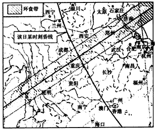 5、单选题 2009年7月22日上午9时左右,千年一遇的日全食将在我国的长江流域上演。目前,江苏的苏州,浙江的嘉兴、杭州、上海、安徽的铜陵等城市成为“日全食经济圈”。读“日全食自西向东扫过我国的地区示意图”,根据材料回答1~3题。