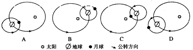 图中实线表示地球围绕太阳公转的轨道,圆形虚线表示月球围绕地球公转的轨道,地球以每天约1°的速度在轨道上自西向东运行。当地球从A运行至B时,月球正好自M1至M2绕地球公转了一周。