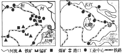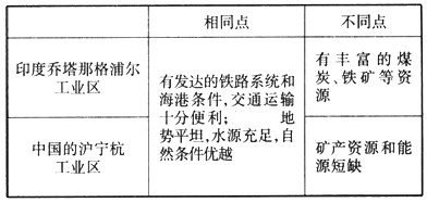 1、综合题  读印度乔塔那格浦尔工业区和中国的沪宁杭工业区图,回答问题。