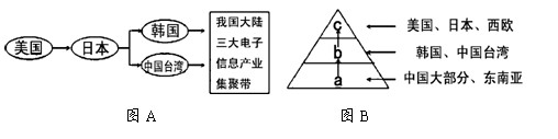 1、单选题 读我国承接全球IT产业转移的路径(图A)和IT产业全球化竞争的金字塔模型示意图(图B),回答1~3题。