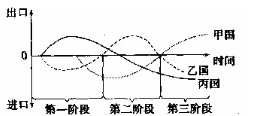小题2:甲国第三阶段才大量出口,技术水平低,利润低,丙国技术水平最高,因为利润降低将该产业转移到其他国家,第一阶段丙国的利润率高于第三阶段的甲国。所以本题选择C选项。
