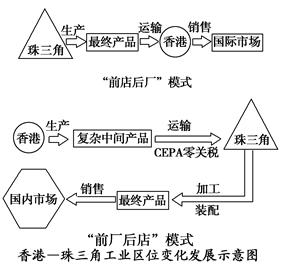 小题1:读图知,“前店后厂”模式的最终产品面向的是国际市场,而“前厂后店”模式的最终产品销往国内市场,故市场变化是影响该地模式转变的最主要区位因素。