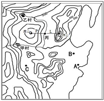 (3)某中学两组同学进行登山比赛,分别沿L、P线路攀登狮山和虎山。有人建议将出发点设在丙点,你认为是否合理?并简述理由。(4分)