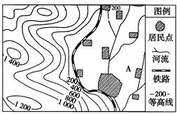 3、单选题 读某地等高线地形图(单位:米),图中居民点的分布特点是 ( )