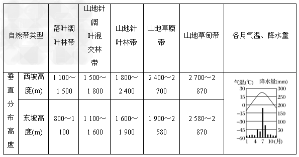 1、单选题 下面图表表示我国某主要地形区中,某山自然带的垂直分布和该地形区中某城市年内各月气温和降水量图。根据所学知识回答8~9题。