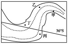 小题2:南半球河流左岸侵蚀,右岸堆积,但在曲流处以凸岸堆积,凹岸侵蚀为主。但甲、乙、丙、丁四处河床,从1月和7月的河面宽度判断,甲处河岸在1月和7月河岸线相差最小,说明坡度最陡的应是甲。
