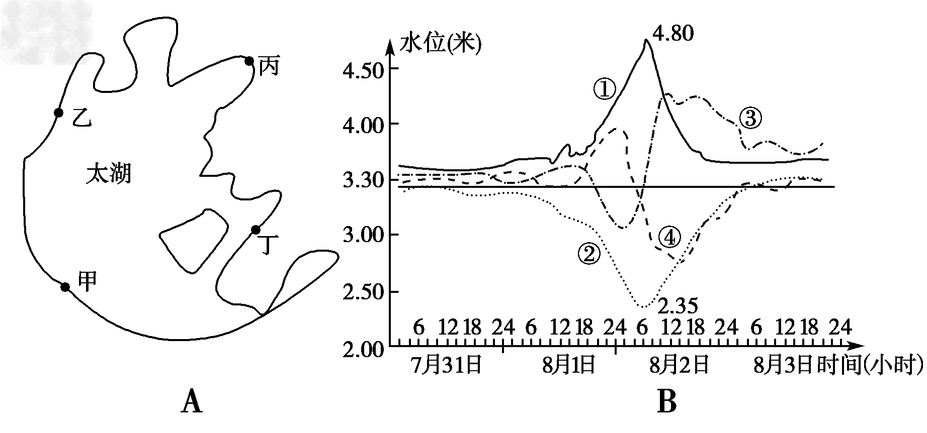 2、单选题 某年一次台风侵袭太湖水域(如图A),湖面风向先为东北风然后转为东南风。图B是沿湖甲乙丙丁4个水文站实测的水位变化过程线,回答1~2题。?
