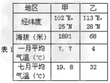 4、单选题 甲、乙两地分别位于我国两大不同地形区中,请根据表1 所提供的甲、乙两地的相关资料,回答1-3 题