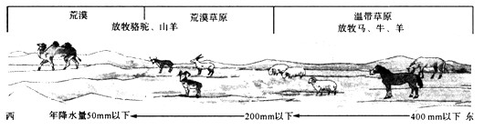 (1)年降水量200~400毫米的地区,大致位于_______山以东的内蒙古高原东部,植被为,主要放牧的牲畜是_______;以西是年降水量小于200毫米地区,植被为________和荒漠,主要放牧的牲畜是_______。