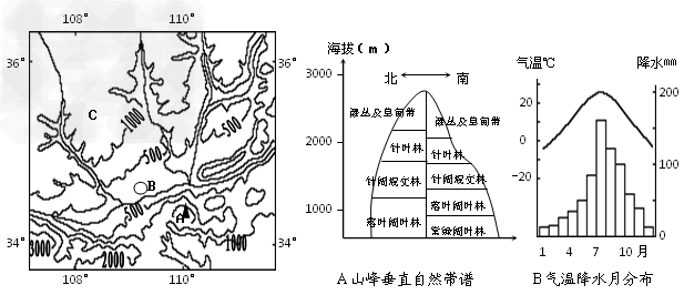 2、综合题 读“我国某地区地形图以及图中A山峰垂直自然带谱图和B点所在地区的气温降水月分布图”,回答下列问题: