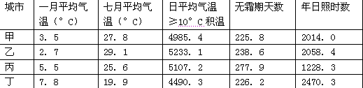 5、单选题 表中甲、乙、丙、丁代表我国成都、武汉、上海、昆明四个城市(不是顺次对应),分析表完成下列各题。