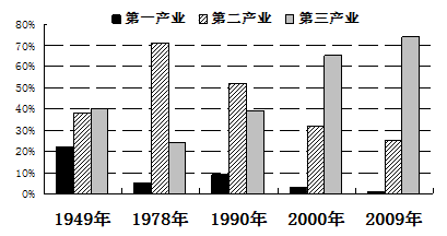 小题1:本题考查地理图表的判读能力。根据图示,三大产业的发展都存在波动,目前第三产业比重达70%以上,占主导地位。所以本题选择D选项。
