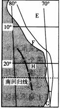 (6)请在图中粗线上添加方向箭头表示H海域洋流的流向,并画一条示意曲线表示该海域表