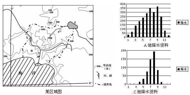 (1)判断B地和Z湖流域的地形类型,并描述A地所在国地形地势特征(8分)