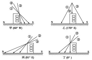 5、单选题 下图中①②③是甲、乙、丙、丁四地二分二至日的正午太阳光线。据此回答下列问题。