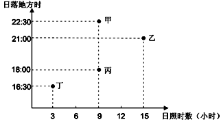 2、单选题 下图表示不同地点6月22日的日落时刻与日照时数(阳光实际照射地面时数)之间的关系,回答下列各题。