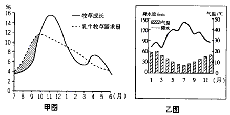 5、单选题 下图中甲图为某地牧草成长与乳牛草料需求关系图,乙图为该地气候资料。回答1—2题。