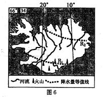 小题2:两条河流都位于沿海地区,都受暖流影响。该地区受西风影响,R1受地形抬升,迎风坡降水多,R2位于背风坡降水少。所以本题选择B选项。