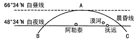 1、单选题 人们把黄昏的余晖与黎明的曙光相接的现象叫“白夜”。图中弧线BAC为晨昏线。读图,回答下列问题。
