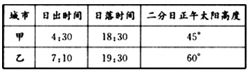2、单选题 下表为我国甲、乙两城市某日日出、日落时间(北京时间)统计表,据此回答1~4题。