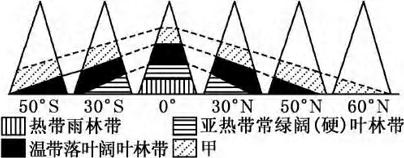 小题1:从水平方向看,甲所在地比温带落叶阔叶林带所在纬度要高.根据由赤道到两极的地域分异规律分析.甲处应该是亚寒带针叶林带。