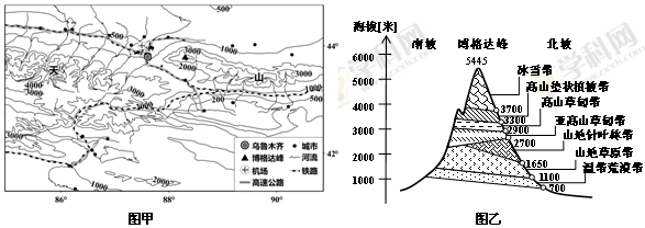 5、综合题 (26分)2013年11月28日举行的乌鲁木齐丝绸之路经济带城市合作发展论坛上,有物流专家指出,乌鲁木齐市可依据现有条件,完善大流通体系,构建丝绸之路经济带物流枢纽城市。图甲是新疆局部地区简图,图乙是博格达峰垂直自然带示意图。完成(1)~(3)题。