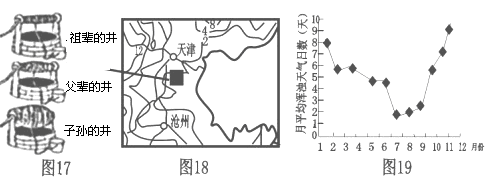 5、综合题 下面三幅图。图18是我国华北地区某区域图,图17反映了图18在A处的水井景观随时间的变化,图19是A处监测到浑浊日数随月份变化图。读图回答下列问题。(10分)